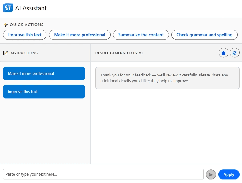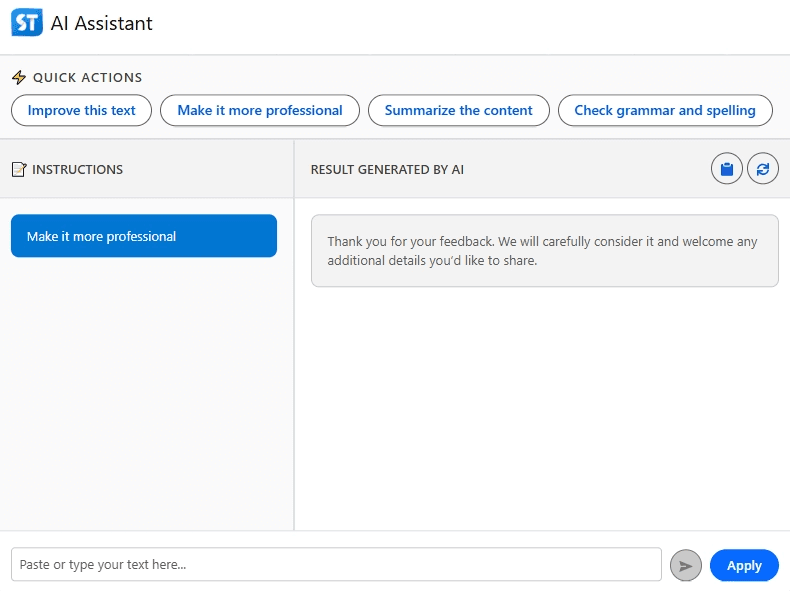 • Custom prompts - Tell the AI exactly what you want: "Make this more formal", "Simplify this explanation", "Add more details", or any custom instruction